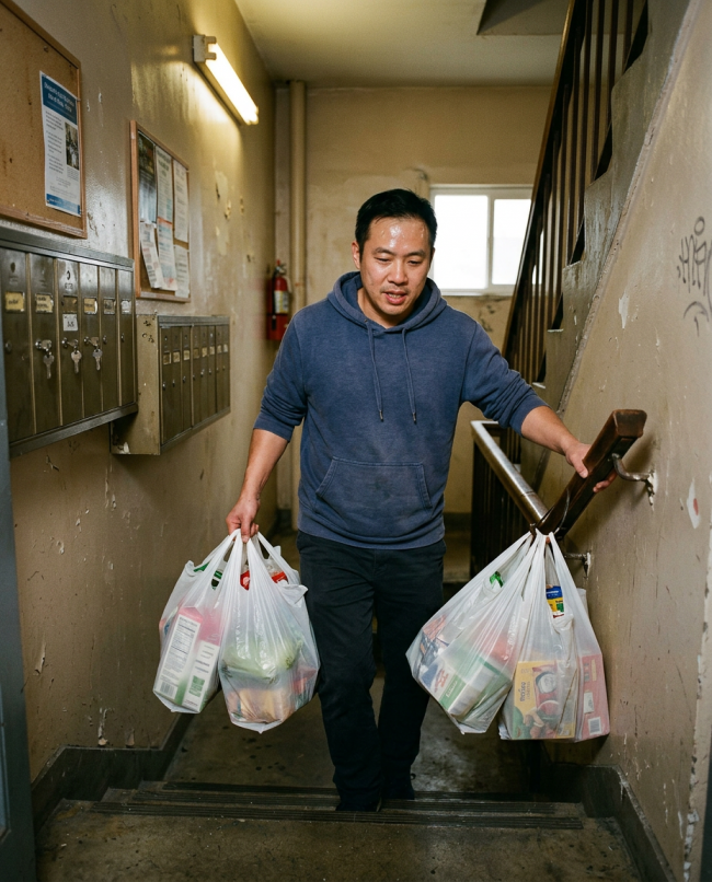 梁練偉今年四十五,在一家物流公司做仓库管理,体力活干了二十多年。他的义工开端是看到邻居老人提着菜在楼梯口喘气,他顺手接过来送上六楼,从此就成了惯例。