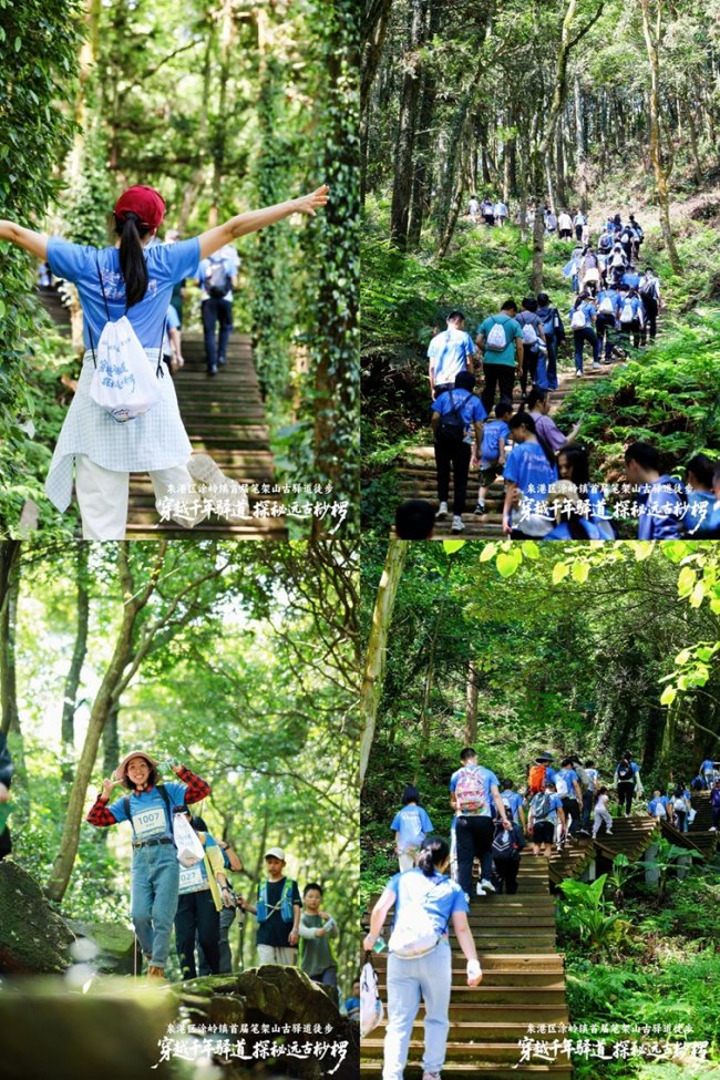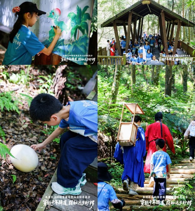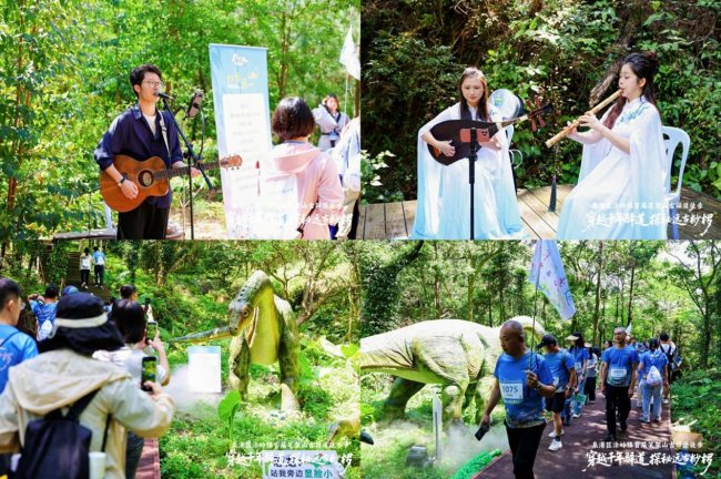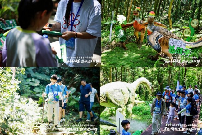 本次活动的核心突破,在于将传统徒步升级为一场主题鲜明、场景多元的沉浸式旅程。路线被巧妙地设计为“古驿道文化、桫椤自然科普、恐龙主题寻宝、古风雅集互动”四重篇章,移步换景、层层递进。参与者穿行于笔架山茂密的原始生态林间——这里桫椤丛生、溪流潺潺、雾气氤氲,宛如置身“亚马逊雨林”般的秘境。
